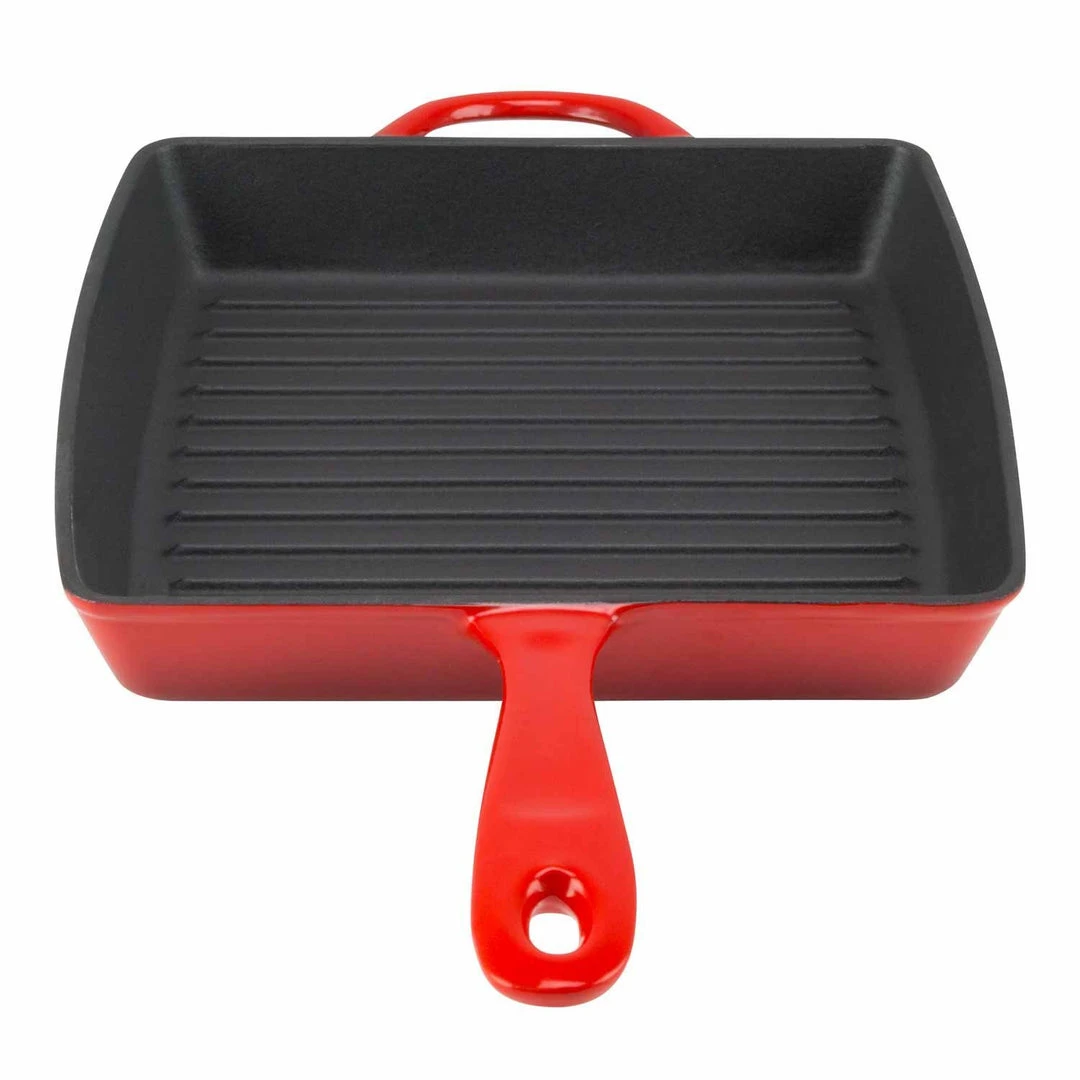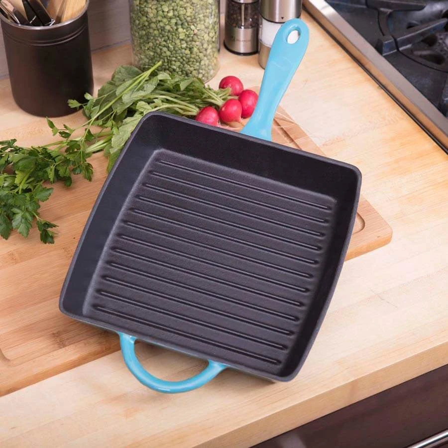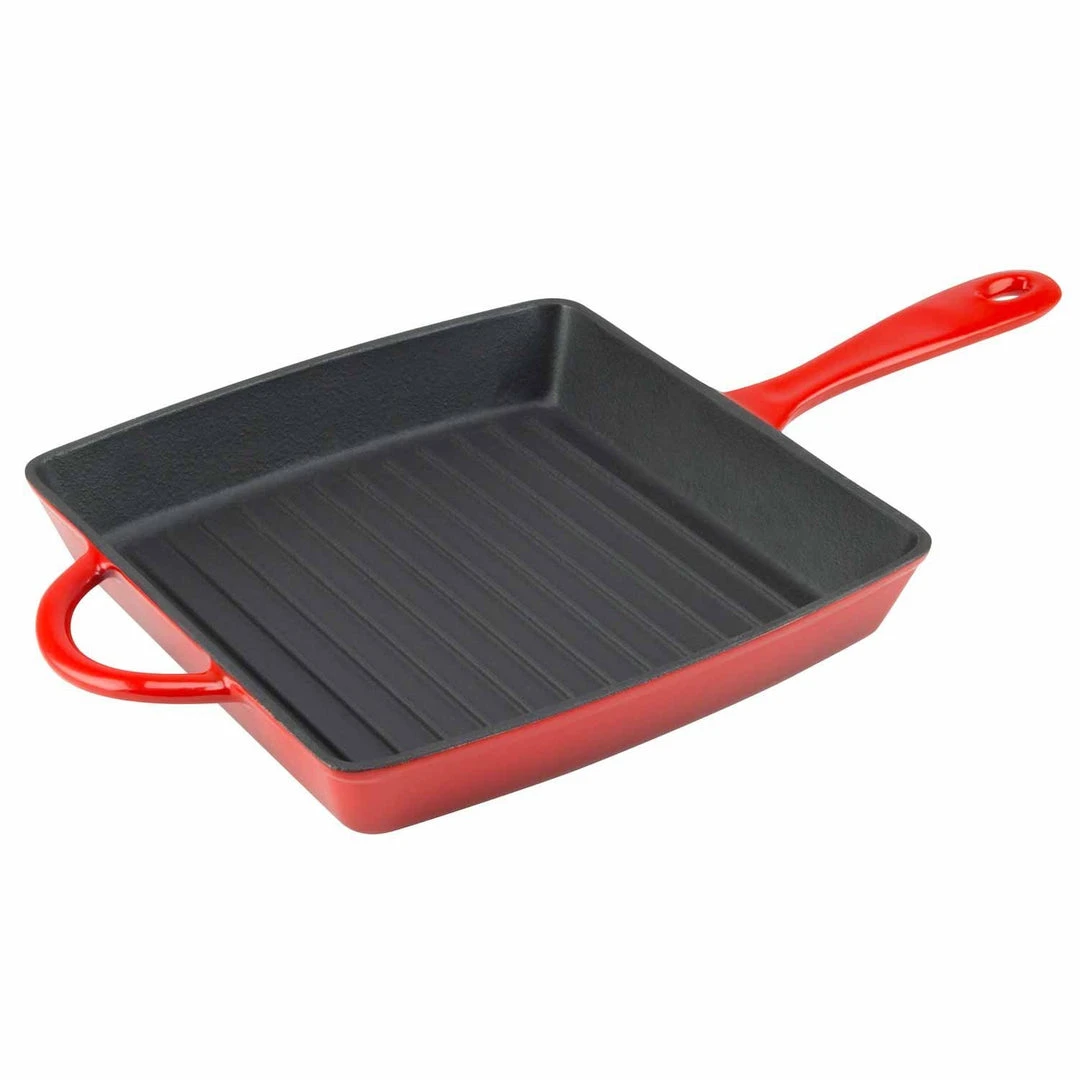 Sear the perfect steak, toast up some grilled cheese sandwiches, or create mouthwatering paninis. The Zelancio square griddle pan has the superior heat distribution qualities of cast iron and the durable, easy-care finish of porcelain enamel. Heat-safe up to 500-degrees Fahrenheit, this cookware goes from stovetop to oven to the broiler, so you can sear and finish meats in the same pan. The vibrant, contemporary colors make it pretty enough to serve in. Choose from rich red, orange, or teal. The one-piece design features large, easy-grip handles on both sides so you can easily lift it from the stove or oven to the dining table. Three layers of durable, chip-resistant porcelain enamel let you sear meats without sticking and make cleanup easy. Ridges on the cooking surface add perfect grill marks and let fat drip away. To keep your cookware looking like new, preheat it for a few minutes before cooking. Handwashing is recommended.