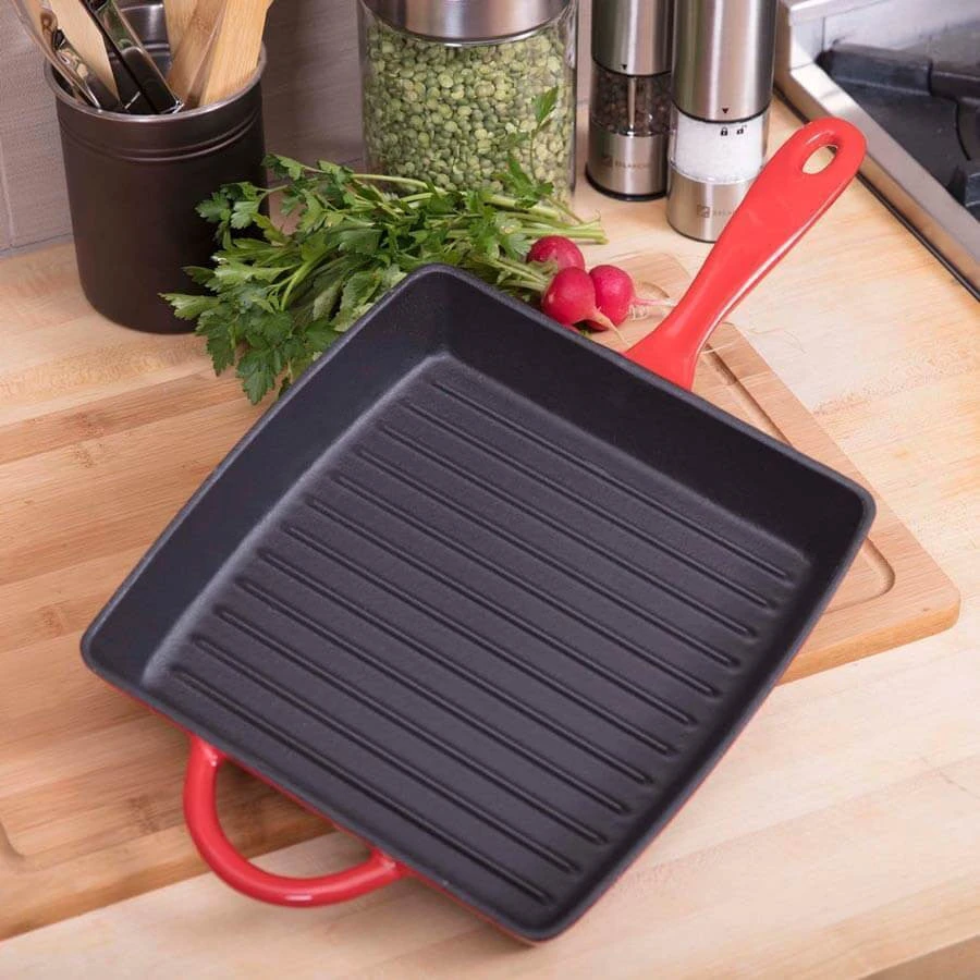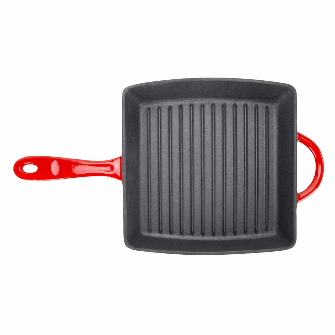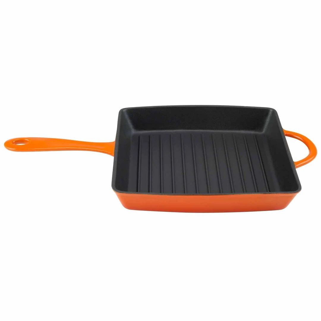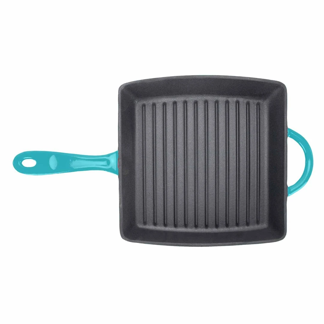 Sear the perfect steak, toast up some grilled cheese sandwiches, or create mouthwatering paninis. The Zelancio square griddle pan has the superior heat distribution qualities of cast iron and the durable, easy-care finish of porcelain enamel. Heat-safe up to 500-degrees Fahrenheit, this cookware goes from stovetop to oven to the broiler, so you can sear and finish meats in the same pan. The vibrant, contemporary colors make it pretty enough to serve in. Choose from rich red, orange, or teal. The one-piece design features large, easy-grip handles on both sides so you can easily lift it from the stove or oven to the dining table. Three layers of durable, chip-resistant porcelain enamel let you sear meats without sticking and make cleanup easy. Ridges on the cooking surface add perfect grill marks and let fat drip away. To keep your cookware looking like new, preheat it for a few minutes before cooking. Handwashing is recommended.