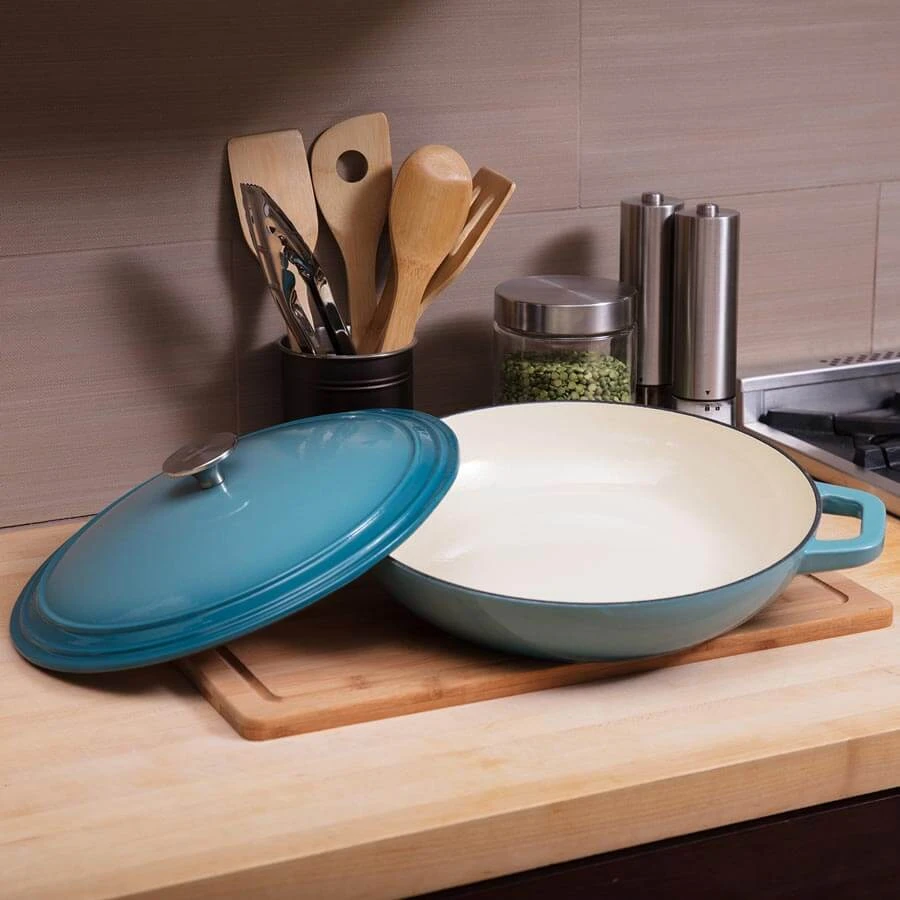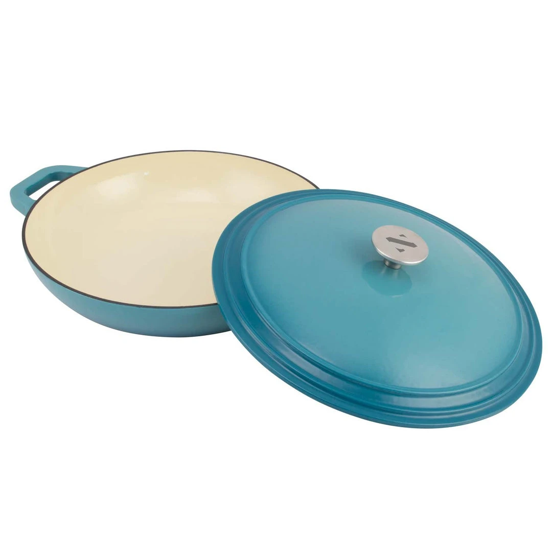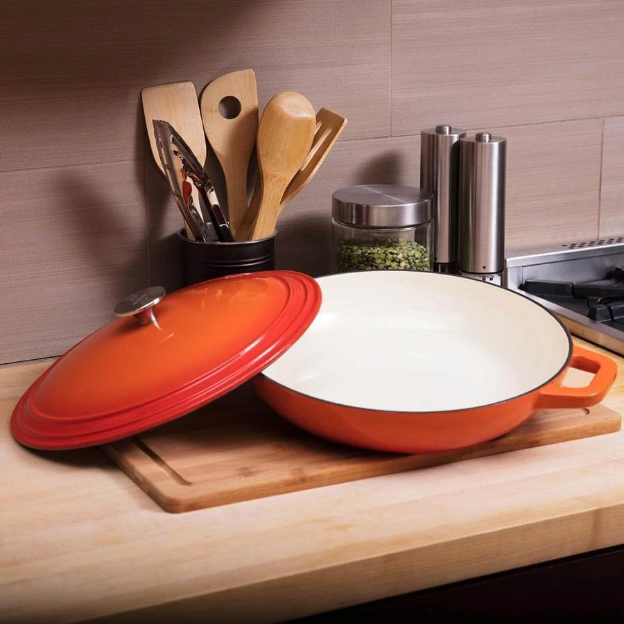 Create savory braised meat dishes, slow-cooked stews, tempting desserts, and comfort foods like noodle casseroles and au gratin potatoes. This versatile set includes a two-inch deep casserole dish and a matching cover. The tight-fitting lid seals in moisture and flavor, and has self-basting condensation bumps on the underside. Designed to withstand temperatures up to 500-degrees Fahrenheit, Zelancio cast iron enamel cookware can go from stovetop to oven to broiler. Vibrant, contemporary colors make the pieces attractive enough to use as servingware. Choose from red, orange, or teal. Heavy-duty cast iron material provides superior heat distribution and the durable porcelain enamel finish is chip resistant.