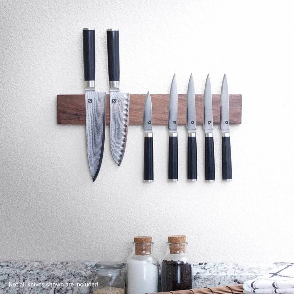 Everything you need to outfit a chef-worthy kitchen in one premium-quality set. Take on family favorites and gourmet recipes with ease. The set includes an 8-inch chef’s knife, 6-inch Santoku knife, a bread knife, utility knife, paring knife, kitchen shears, and honing rod, so you’ll be ready to tackle prep no matter what’s on the menu. Dark Pakkawood handles feature an ergonomic design and a universal grip. The knife blades are constructed of 67 layers of folded Damascus steel wrapped around a premium Japanese VG-10 carbon steel core. The set comes in an attractive presentation box and makes the perfect wedding gift or housewarming gift.